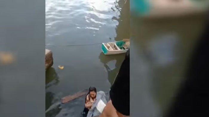 Beruntung, wanita tersebut segera berpegangan pada tali perahu yang tengah bersandar di bawah jembatan.