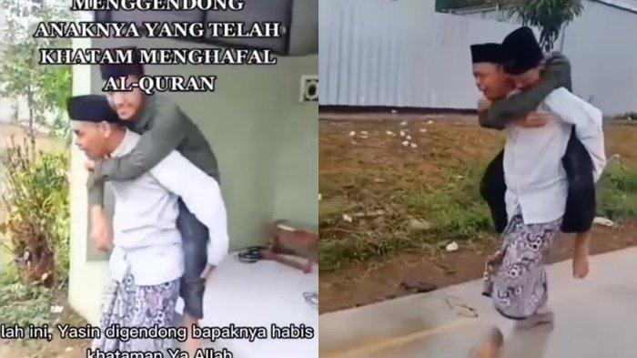 TRIBUNTRENDS.COM - Kisah haru seorang ayah menggendong putranya yang berhasil khatam Alquran.