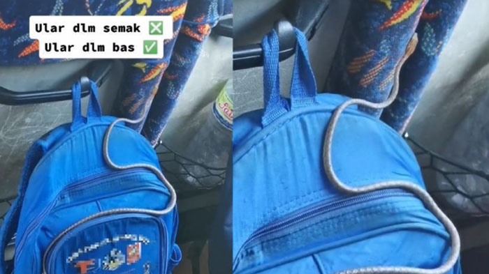 Sebuah video menunjukkan seekor ular melilit tas seorang siswa dibagikan oleh seorang wanita di media sosial.