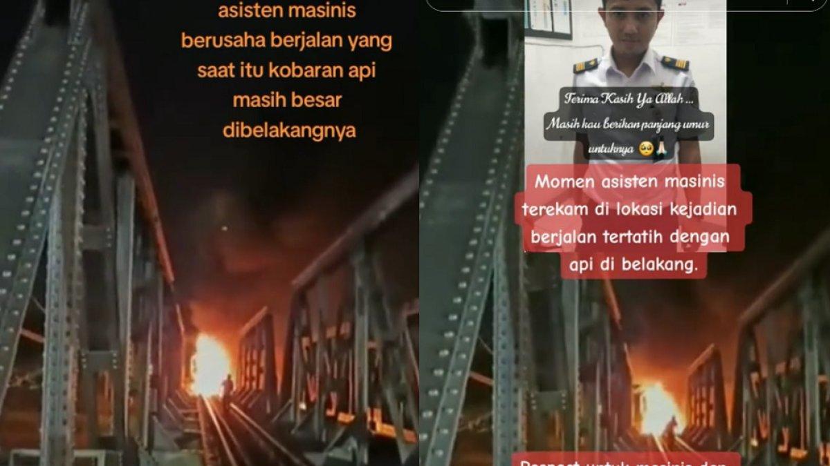 Di video yang diunggah akun TikTok @herliahli, terekam seorang asisten masinis berjalan tertatih di depan kobaran api dari ledakan akibat kecelakaan.