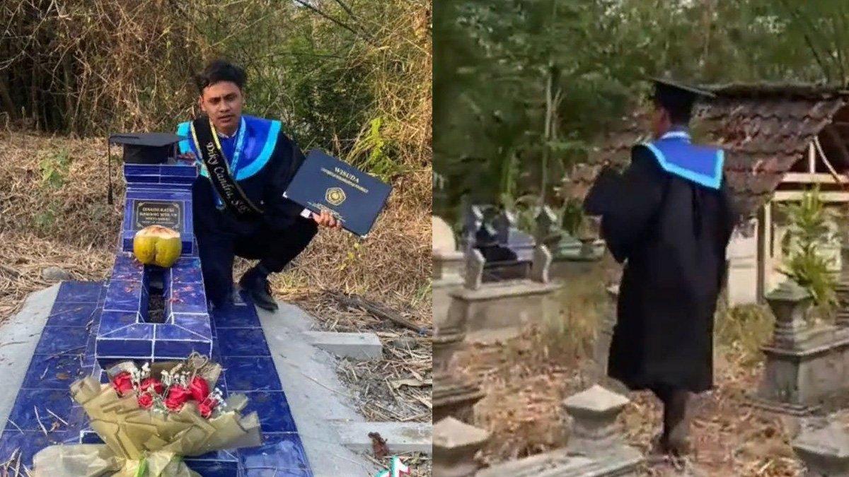 Pada keterangan unggahan disebutkan jika sang pria telah menepati janji untuk menyambangi makam istrinya setelah wisuda.