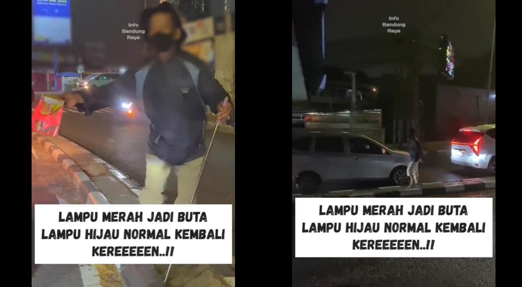 Aksi pengemis pura--pura buta ini terekam kamera pengguna jalan di simpang lampu merah di daerah Bandung, Jawa Barat.