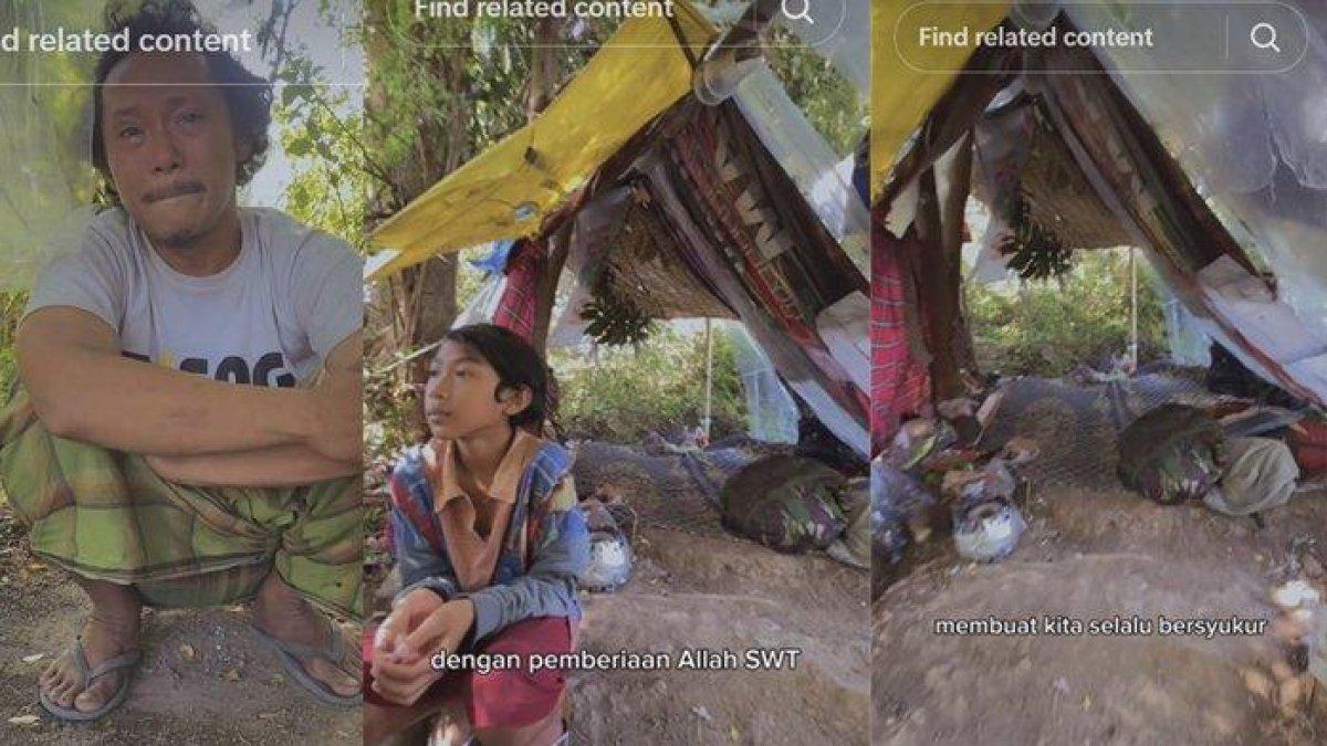 Viral sepasang bapak dan anak ditemukan tinggal dalam kondisi tidak layak di bawah tenda bambu, atapnya dari plastik, lantai hanya beralas tikar.