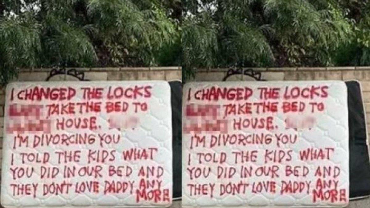Tak terima, sang istri lantas membuang kasur bekas itu ke depan rumah dan menuliskan unek-uneknya.