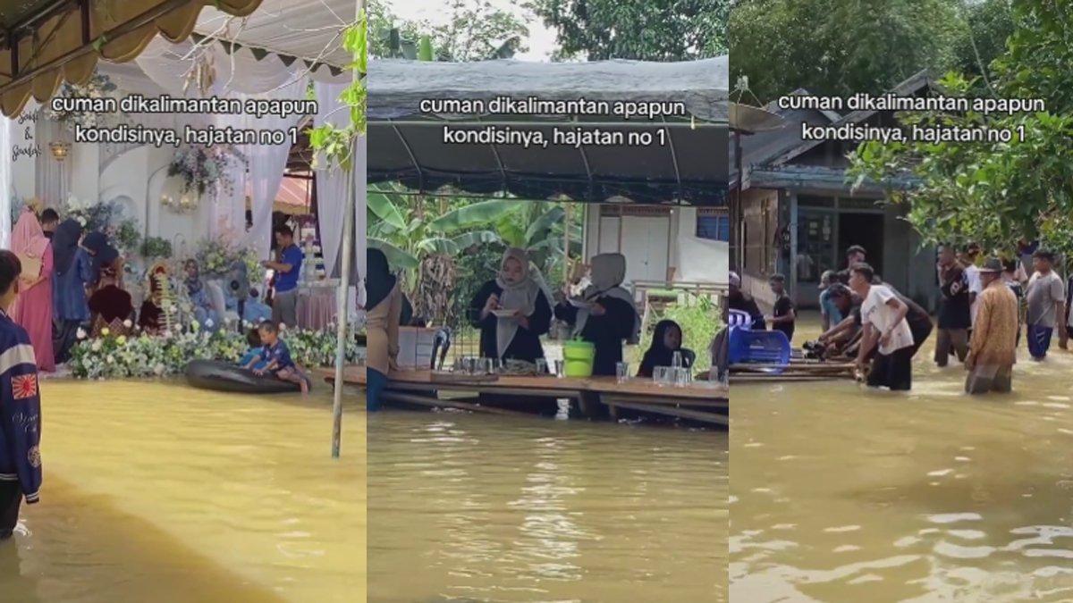 Viral video pesta pernikahan yang diterjang banjir, namun resepsi tetap berjalan dan banyak tamu berdatangan