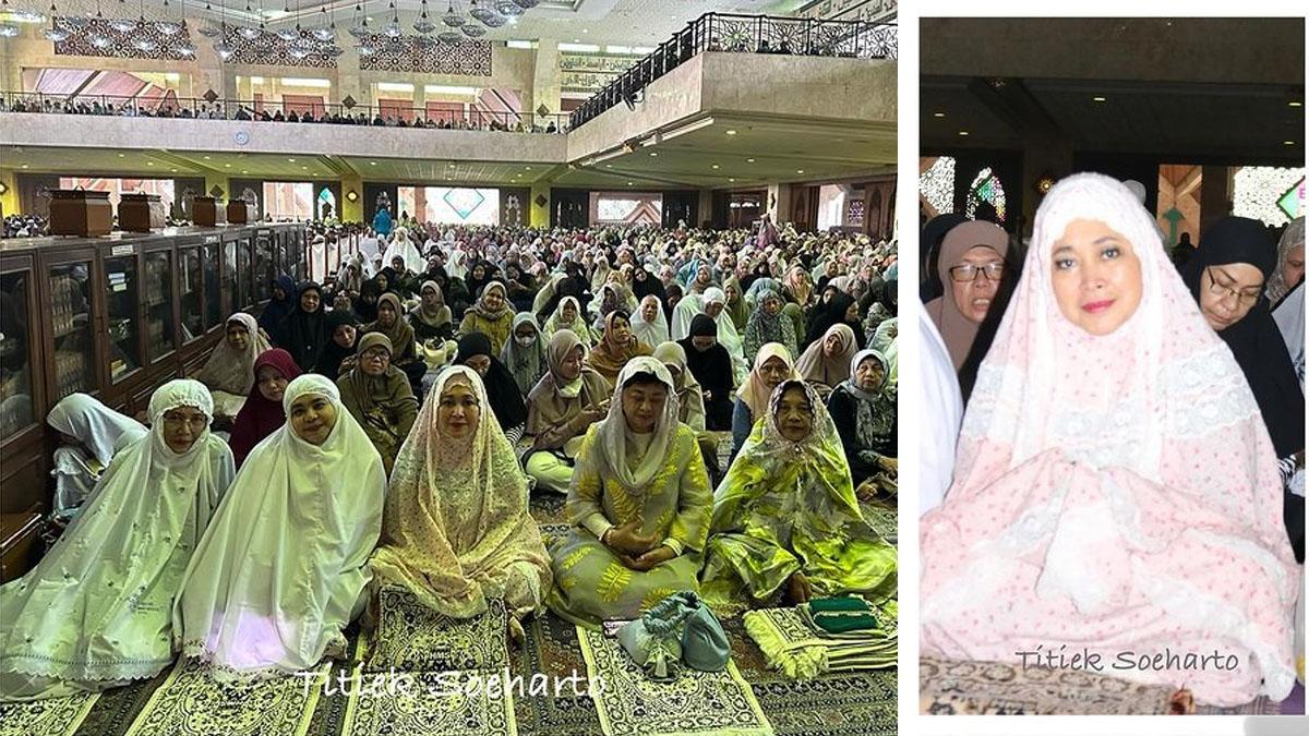Titiek Soeharto terlihat melangsungkan sholat ied di masjid At-Tin bersama ribuan jamaah lain.
