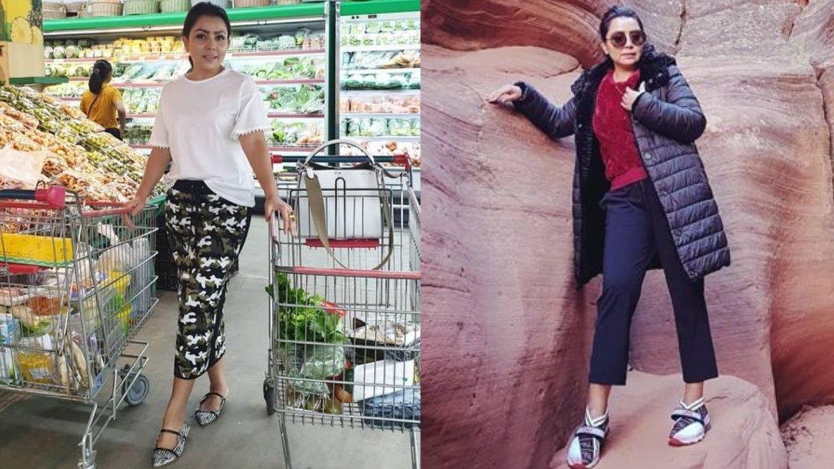 Dalam foto tersebut erlihat Mayangsari tampil modis dengan paduan kaus merah yang dilapisi dengan jaket puff serta celana panjang berwarna hitam.