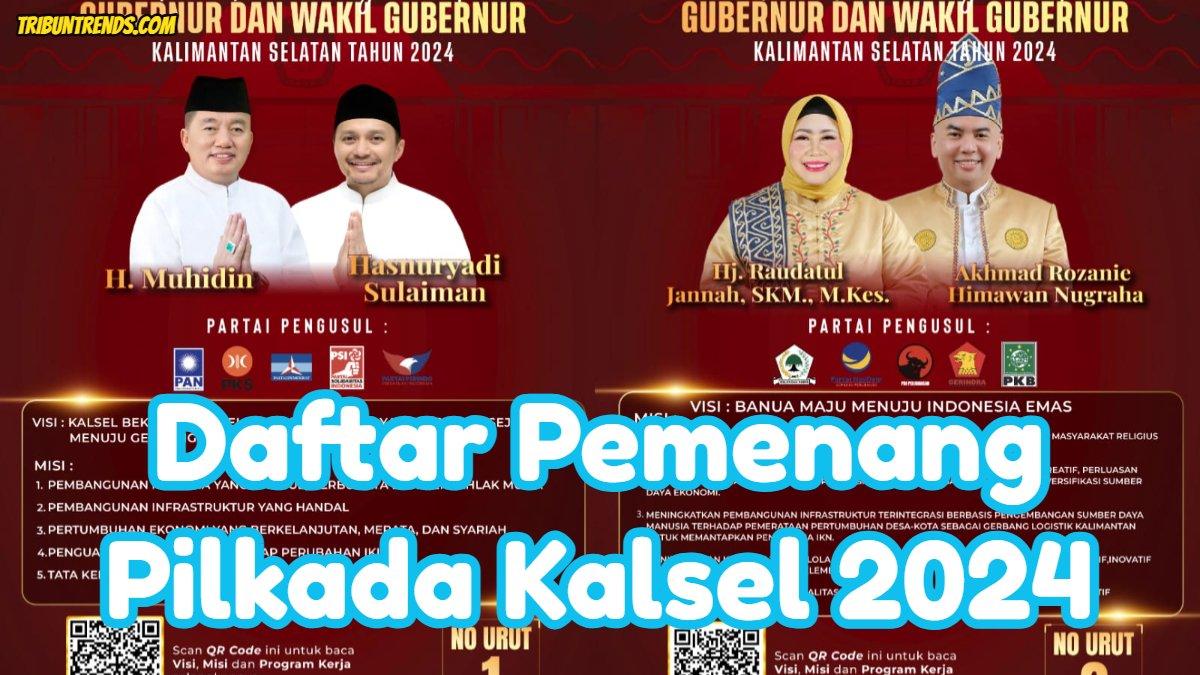 TRIBUNTRENDS.COM - Berikut ini daftar pemenang dalam memperebutkan kursi gubernur, bupati dan walikota di Pemilihan Kepala Daerah (Pilkada) Kalimantan Selatan (Kalsel) 2024.