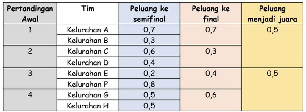 Dalam rangka memeriahkan HUT RI ke-76, Kecamatan M mengadakan perlombaan futsal antar kelurahan. Dari 11 kelurahan yang ada di Kecamatan M hanya 8 kelurahan yang mengikuti perlombaan tersebut. Babak yang harus dilewati untuk menjadi juara pada pertandingan futsal adalah babak awal, babak semifinal, dan babak final. Pada babak awal, 8 tim futsal peserta lomba akan diundi untuk melakukan pertandingan awal. Setiap tim hanya akan bertanding sekali pertemuan dengan tim lawan. Tim yang menang akan diundi untuk bertanding dengan tim lainnya di babak final. Berdasarkan hasil pemantauan latihan dari setiap tim, dilakukan prediksi peluang tim lolos ke babak semifinal, babak final hingga menjadi juara. Berikut peluang dari setiap tim untuk menjadi juara.